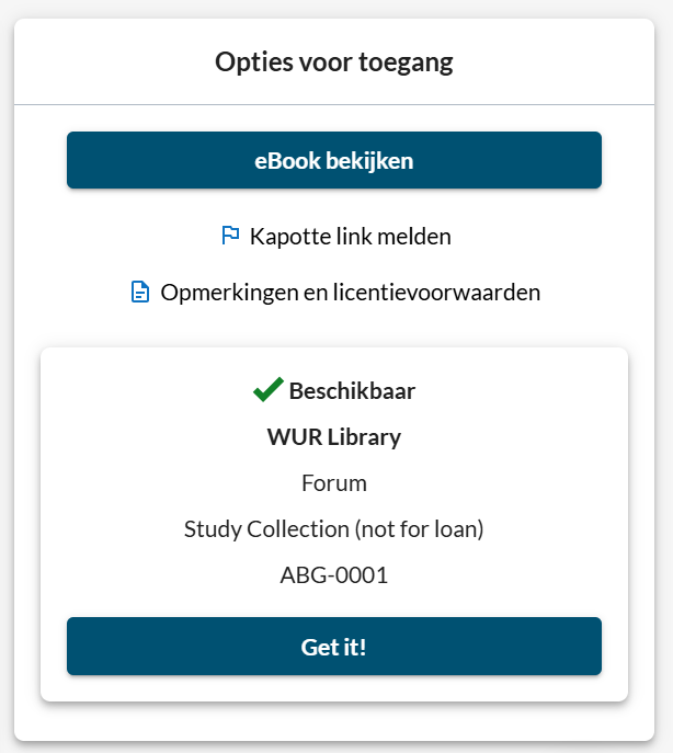 Soms is een boek zowel in de Study Collection als in de open opstelling n de Forumbibliotheek (Forum Books) beschikbaar. Items in Forum Books zijn te leen. Je kunt het boek zelf uit de kast pakken. Het signatuurnummer geeft aan waar het boek zich bevindt. Als het boek is uitgeleend, kunt je reserveren via de blauwe Get it! knop.