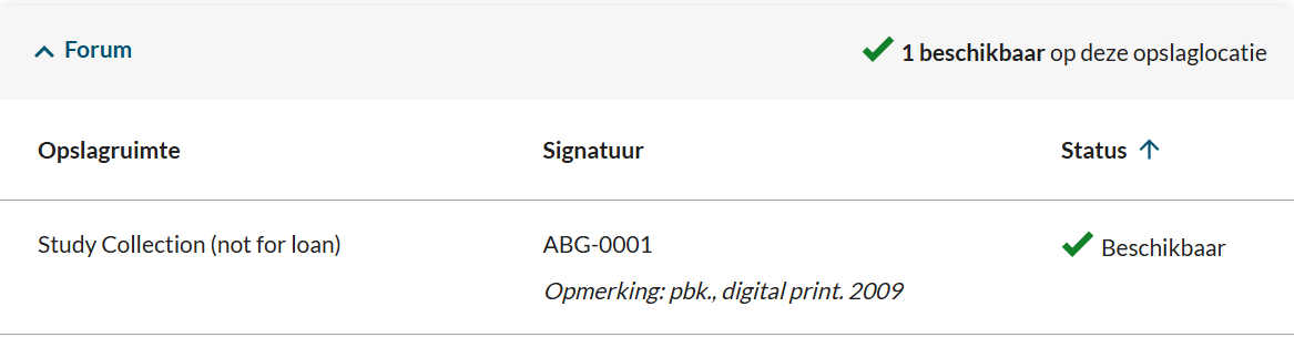 Onder 'beschikbaarheid' kun je zien dat je het boek online kunt lezen en dat het gedrukte boek in de Study Collection staat met het signatuurnummer ABG-0001.