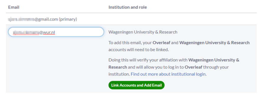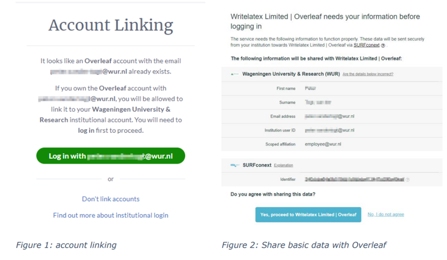 3. Type in your WUR email address. If this email address is already used for an Overleaf account, you will be asked if you want to link to your existing account or create a new one (figure 1).