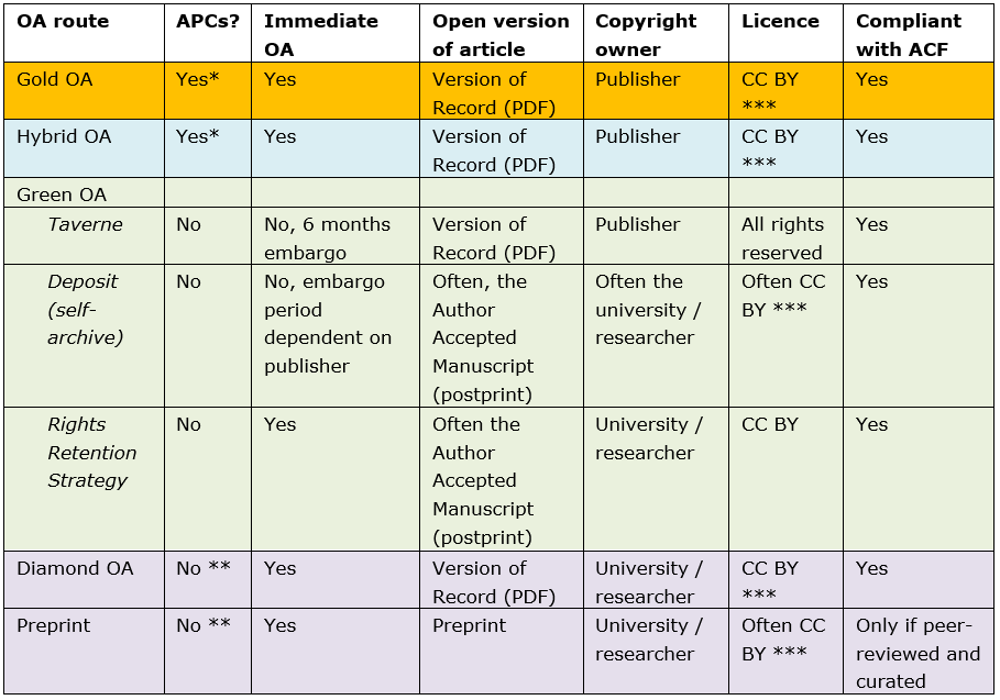 In the following table, you can find an overview of the different Open Access routes and their characteristics.