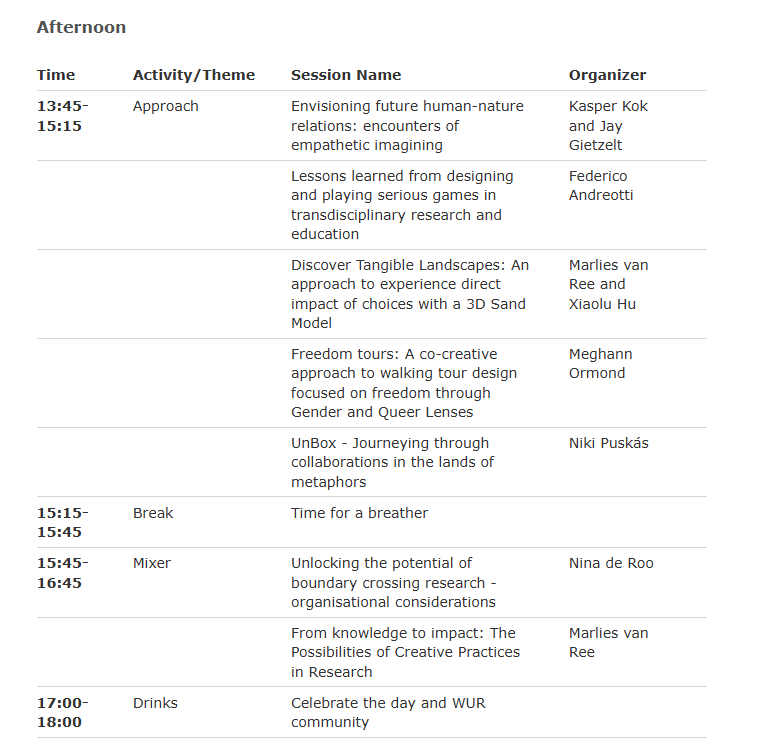 Everyone within WUR working on inter- and transdisciplinarity in all its forms are welcome to join. Come and interact with (new) networks, experience different approaches, and link up to the WUR-wide inter- and transdisciplinary community!
